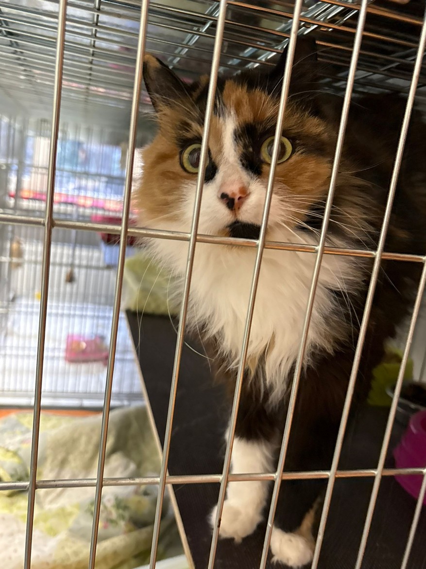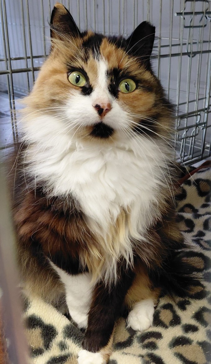 Lūsija, trīskrāsu kaķenīte, apmēram 3 gadus jauna un ar sejiņu, kas izskatās tā, it kā viņa vienmēr par kaut ko brīnītos