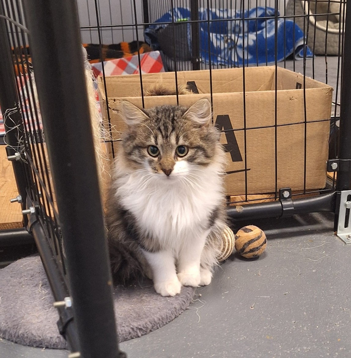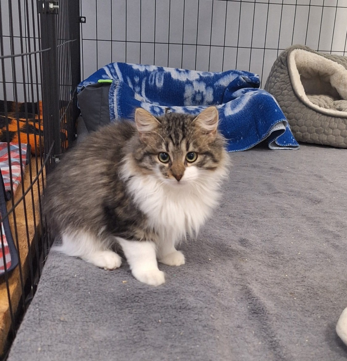 Apmēram 3 mēnešus jauna kaķenīte, kuras izskatā saskatāmas lūša un meža kaķa iezīmes – kupls kažoks, rotaļīgi ausu pušķīši, īpašs purniņa krāsojums un modrs, piesardzīgs skatiens.