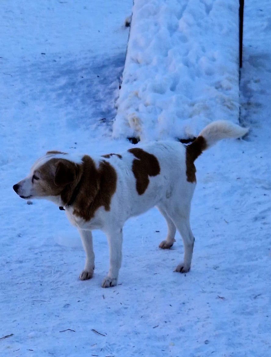 Nora ir skaista kucīte ar balti- rudu spalvu.